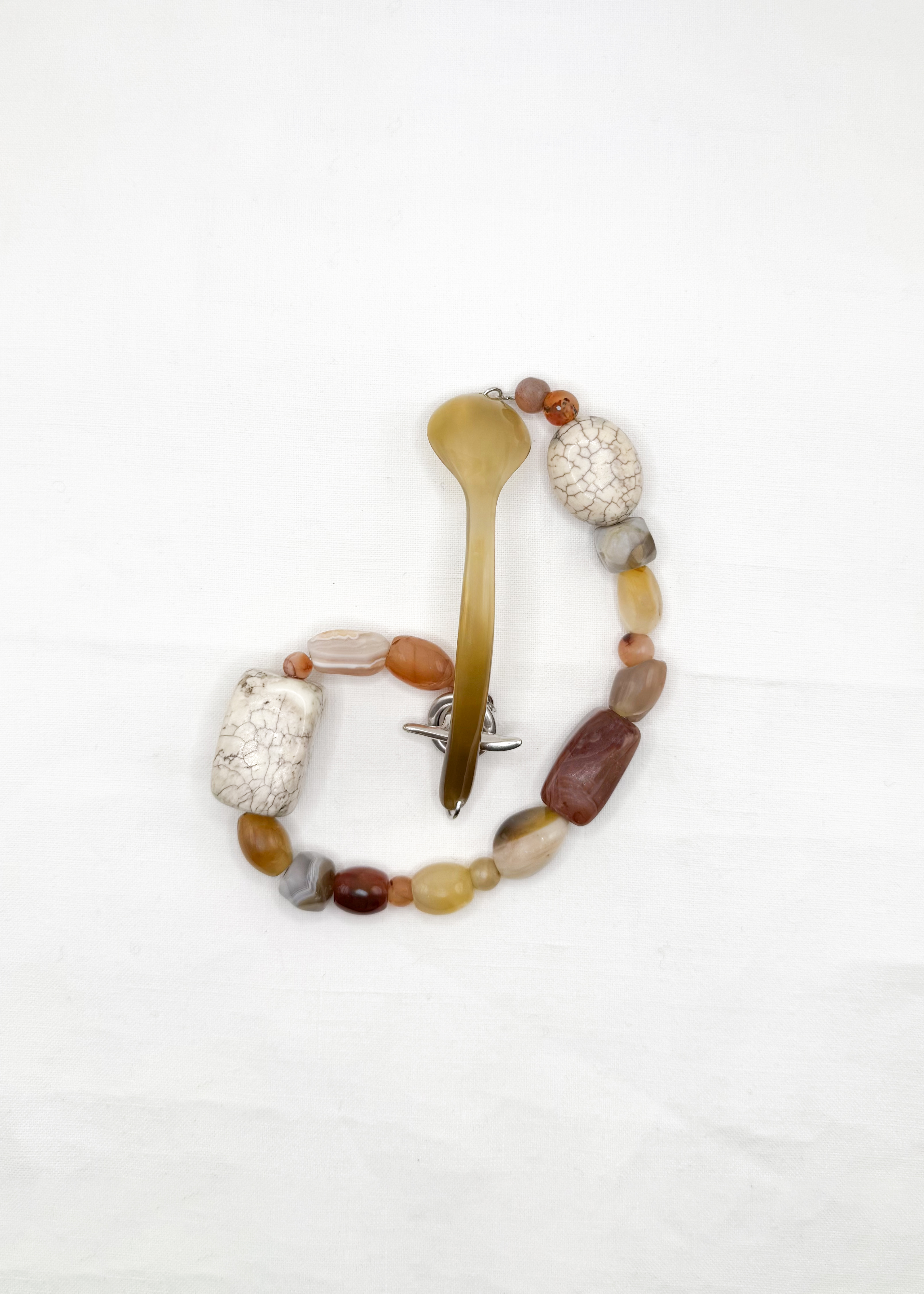 Le collier PIZ BOE est composé d’une cuillère à caviar en corne de zébu et de différentes pierres naturelles.