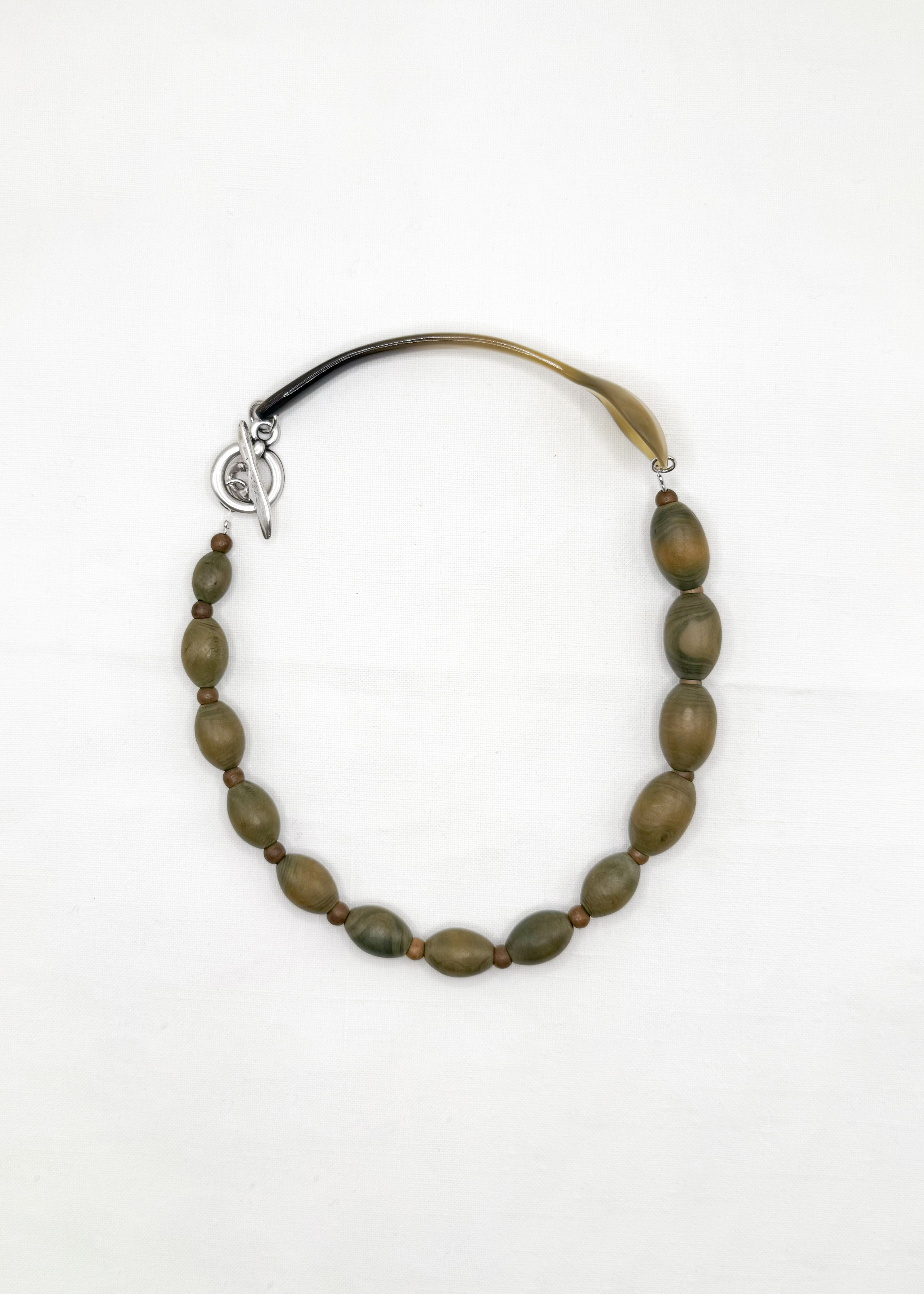 Le collier PIZZO ROTONDO est composé d'une cuillère à caviar en corne de zébu et de perles en bois anciennes vertes.