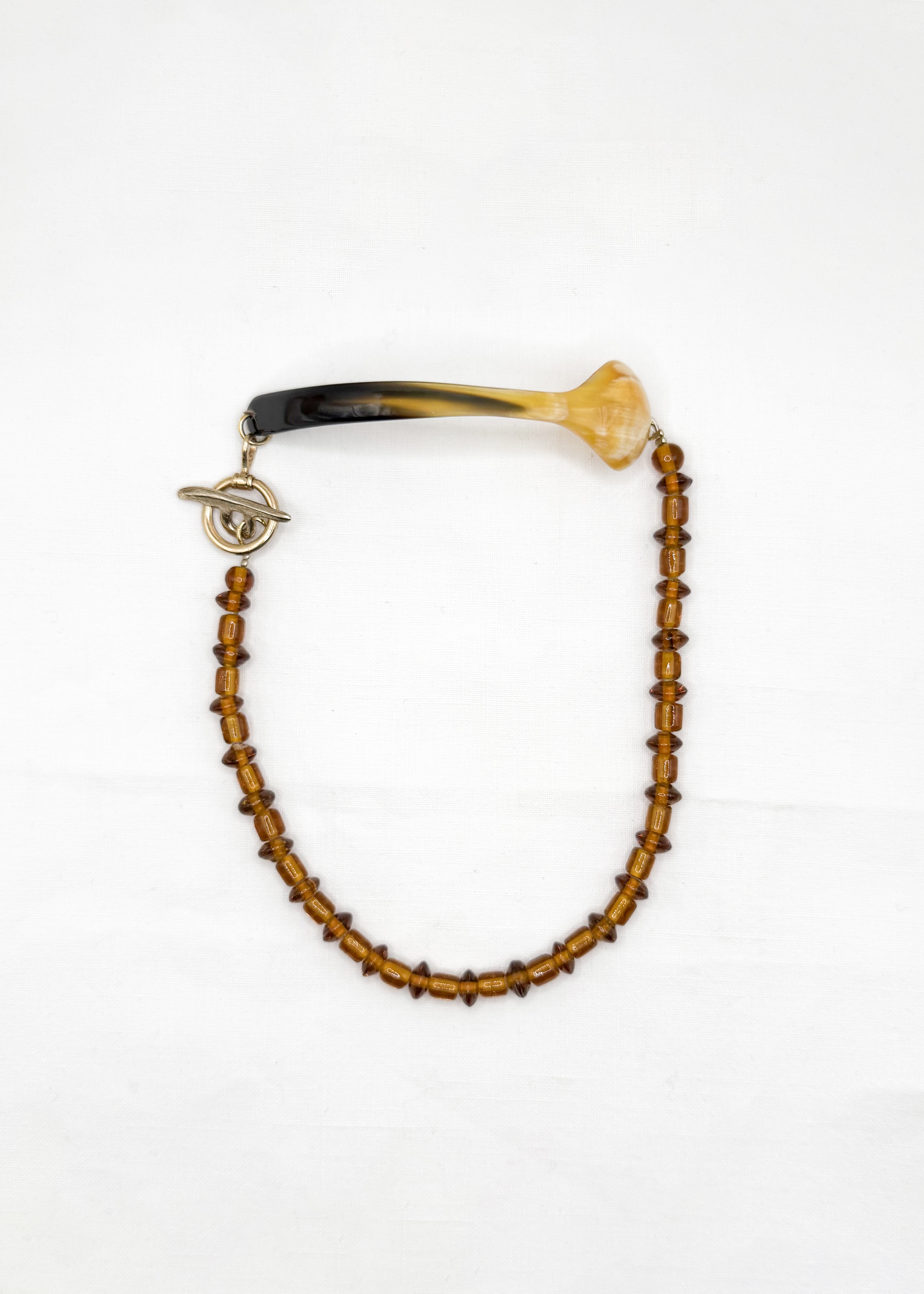 Le collier SASSOLUNGO est composé d’une cuillère à caviar en corne de zébu et de perles en verre.